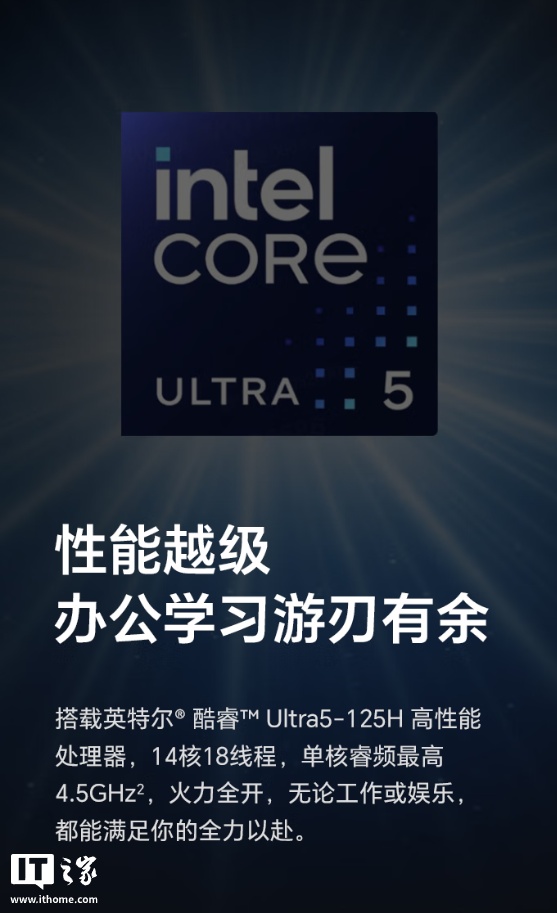 这款笔记本搭载 14 英寸高清雾面大屏,采用窄边框设计,分辨率达 2800*1800,最高亮度 430 尼特,色域达 100% sRGB,通过德国莱茵 TUV 双重护眼认证,拥有英特尔酷睿 Ultra 5 125H 处理器,采用 14 核 18 线程设计,单核最高睿频可达 4.5GHz,高能模式下最高性能释放可达 40W。