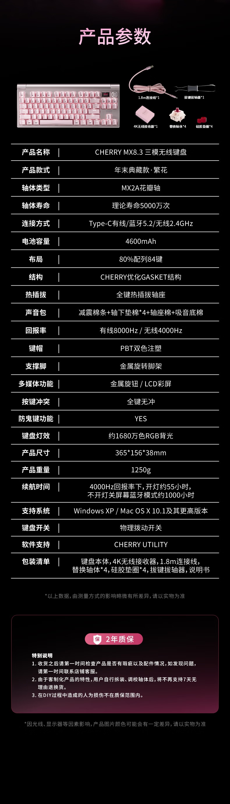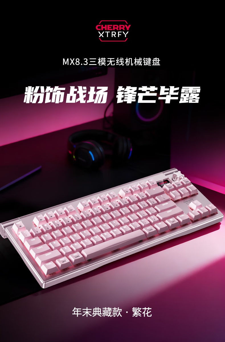 alixixi 10 月 31 日消息,樱桃(CHERRY)今日宣布,年末典藏款 MX8.3「繁花」电竞键盘今晚 8 点开售,京东显示为 2025 元,首发 9 折券后 1822.5 元。