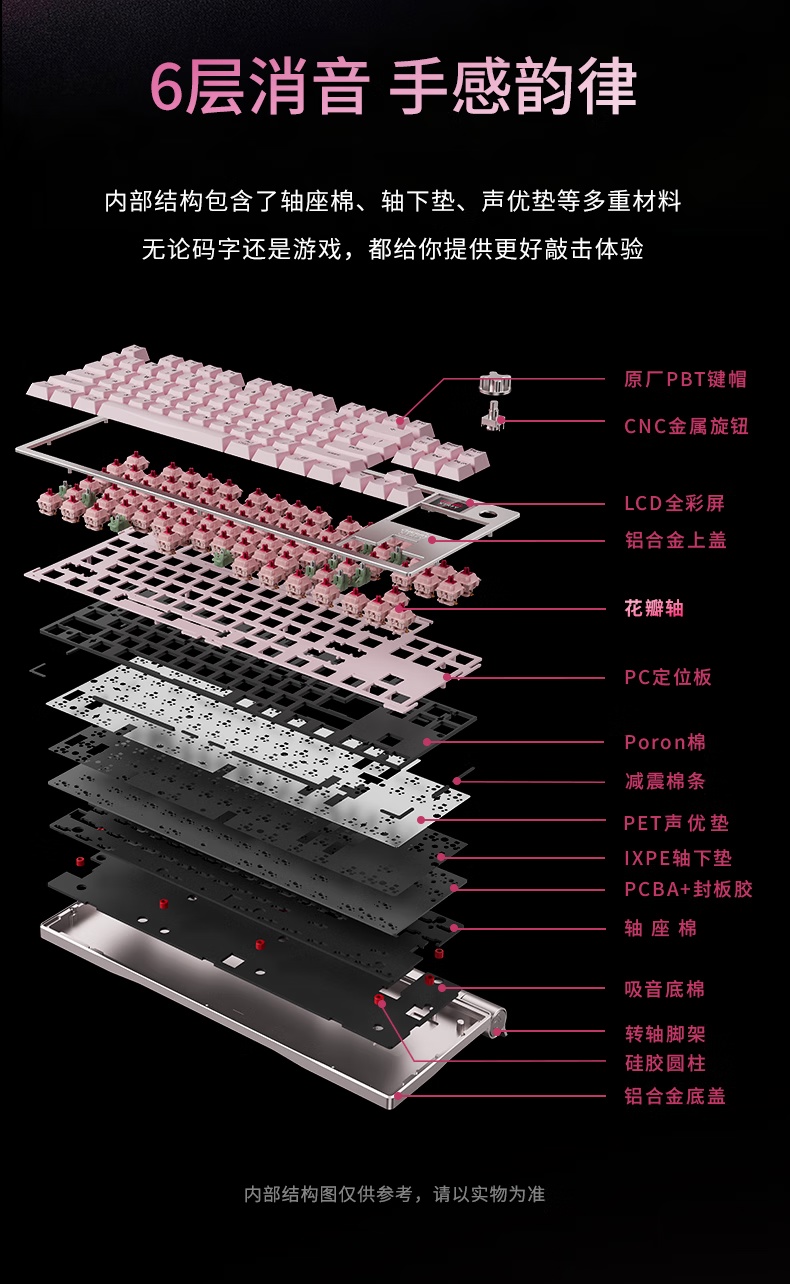 此外,这款键盘采用了“特调花瓣轴”(alixixi注:由【平衡大师】茶轴演化而来,内部使用高质量润滑脂、加长弹簧),附赠专属粉色铝箱,最高 8000Hz 回报率,支持 2.4G、蓝牙、USB 三模连接,支持全键热插拔。