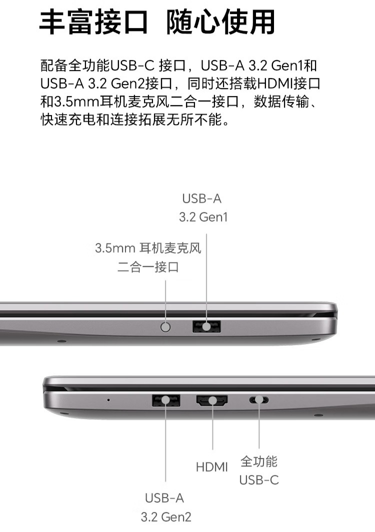 其他方面,该机可实现 40W 性能释放,配备 42Wh 电池,拥有 HONOR Turbo X 基础技术调校加持,可提供 8.2 小时续航,支持 65W 快充,配备独立小键盘,支持荣耀智慧互联,提供全功能 USB-C、双 USB-A、HDMI、3.5mm 等接口(alixixi附图如下)。