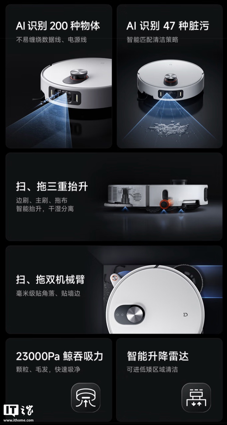 系列扫地机器人提供 23000Pa 吸力,匹配扫、拖双机械臂,号称可以实现毫米级贴边扫净、拖净;机身搭载升降式激光雷达,最低可进入 9.5cm 低矮区域清洁。