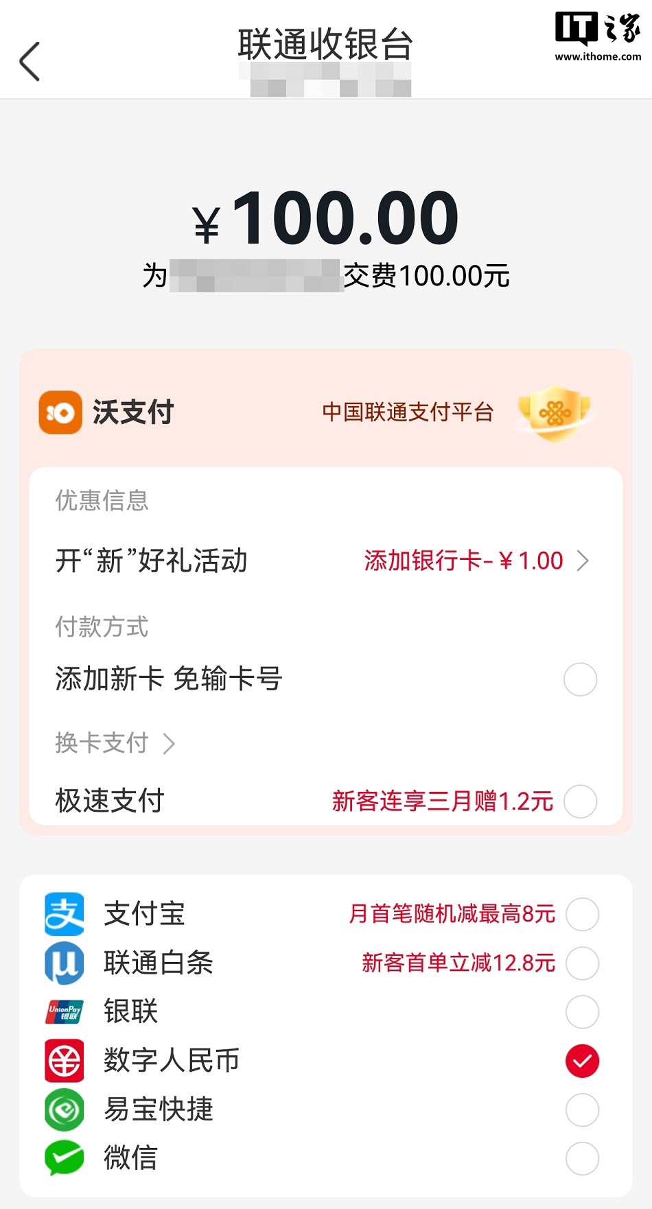 官方同时表示,数字人民币还融入鸿蒙 5 的 Payment Kit(鸿蒙支付服务),实现“数字人民币收银台”功能。例如在使用中国联通进行话费充值时,在付款界面可选择“数字人民币”进行支付,真正实现“拿到手机就能用”,将数字人民币服务延伸至每一个普通用户和每一个消费场景。