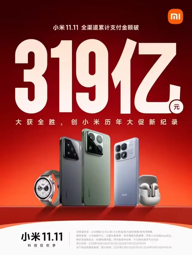 alixixi 11 月 1 日消息,据小米公司官方微博,小米宣布截至 2025 年 10 月 31 日 23:59:59,双 11 全渠道累计支付金额破 182 亿元。