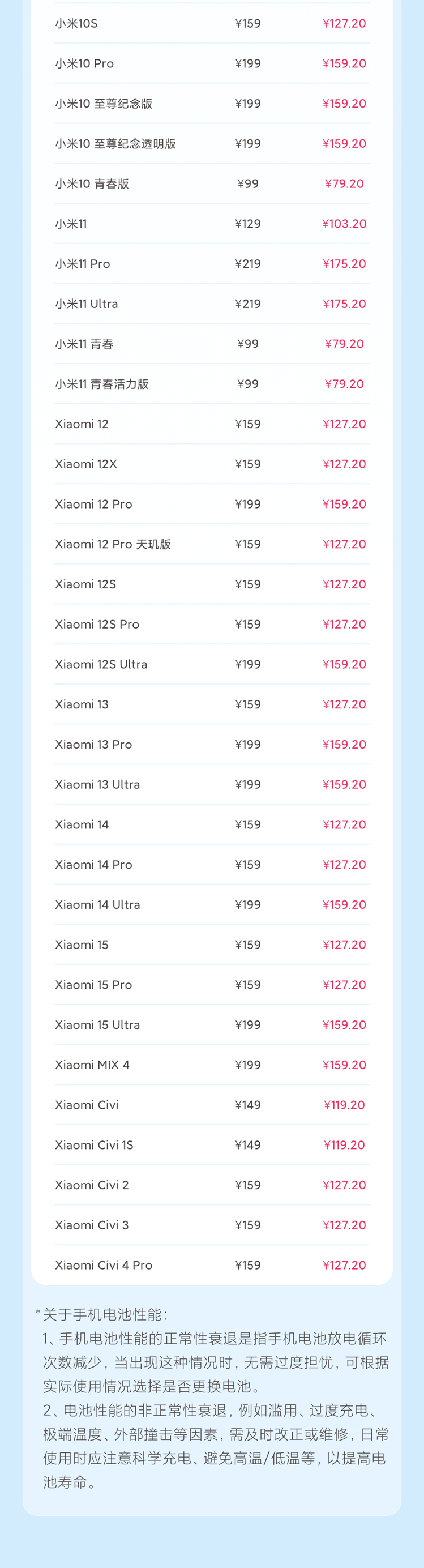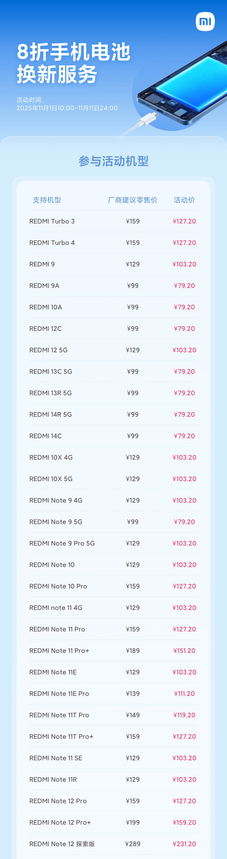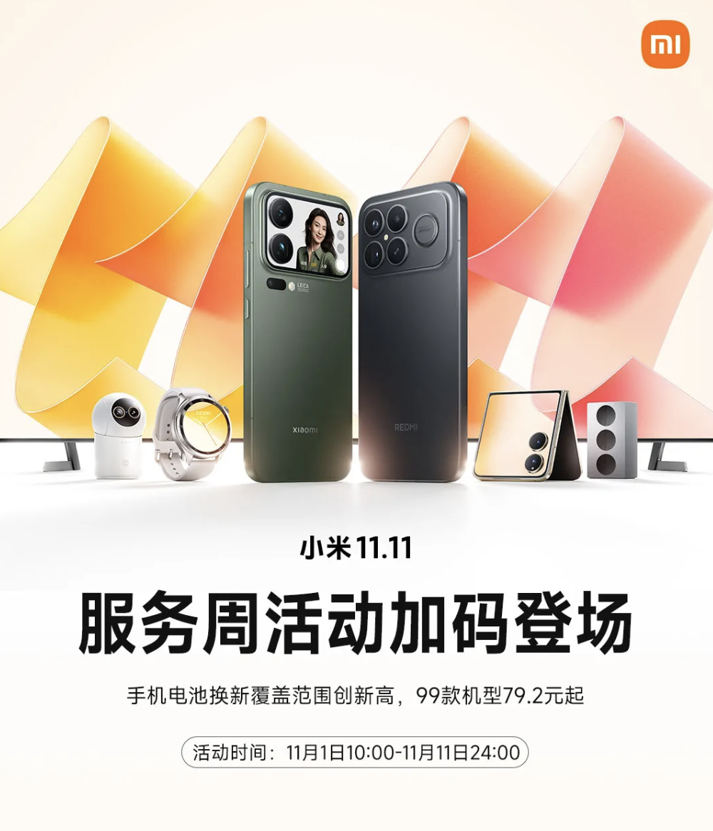 alixixi 11 月 1 日消息,小米 11.11 服务周活动今日上线,手机电池换新 79.2 元起,小米、REDMI 品牌笔记本 5 折深度清洁,家电清洁一口价 99 元,活动时间为 11 月 1 日 10:00-11 月 11 日 24:00。具体支持机型如下:
