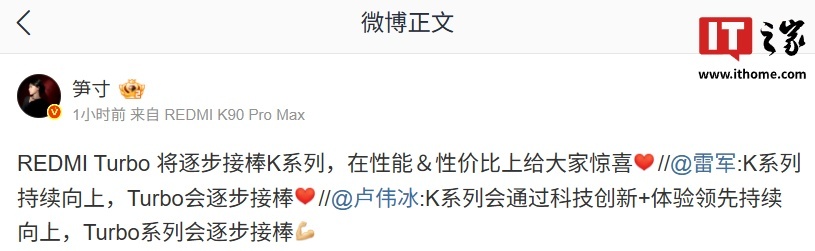 小米集团合伙人、总裁,手机部总裁,小米品牌总经理卢伟冰 10 月 25 日发文表示:“K 系列会通过科技创新 + 体验领先持续向上,Turbo 系列会逐步接棒。”小米创办人,董事长兼 CEO 雷军也发文称:“K 系列持续向上,Turbo 会逐步接棒。”