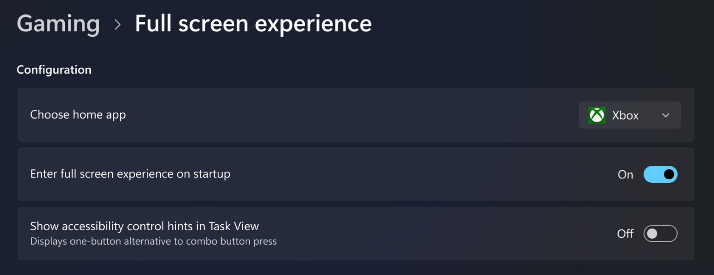 在游戏体验方面,本次预览版开始向微星 Claw 等更多设备推送更新,让其可以享受华硕 ROG Ally 系列上的全屏游戏体验(FSE)。该模式提供类似游戏主机的无干扰界面,并与 Xbox PC 应用配合,可优化系统资源。