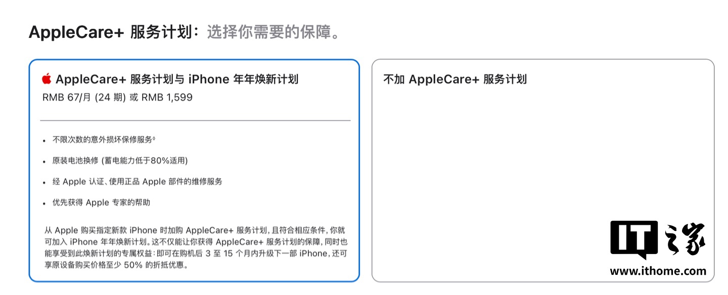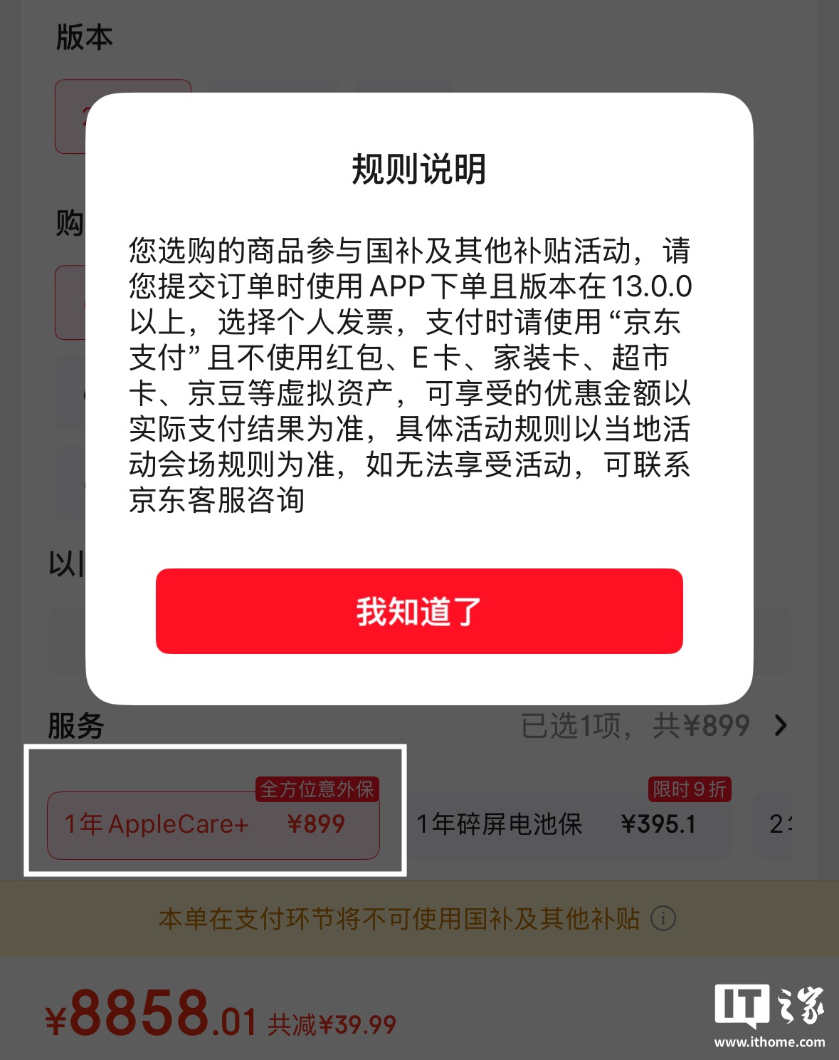 alixixi提醒,如果用户通过国补云闪付渠道下单该产品,则不支持以 899 元优惠价格加购 Apple Care+ 服务,用户后续购买 Apple Care+ 服务需要支付 1599 元。