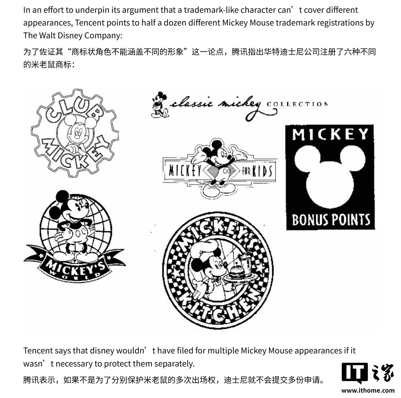 为进一步强化论点,腾讯罕见地援引了迪士尼“米老鼠”的案例。腾讯辩称,一个角色在电影中是否可被识别,不等于该角色改变外观后仍能作为单一商标。