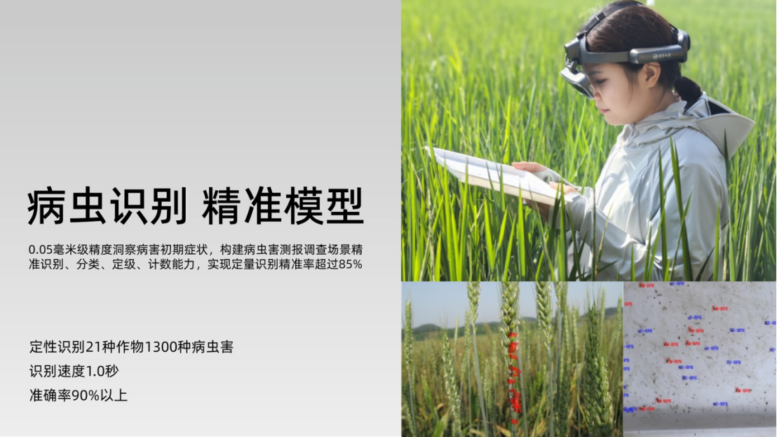 在病虫识别场景中,凭借精准模型,以0.05 毫米级精度洞察病害初期症状,构建起病虫害测报调查场景的精准识别、分类、定级、计数能力,定量识别精准率超 85%。同时,可定性识别 21 种作物的 1300 种病虫害,识别速度仅 1.0 秒,准确率达 90% 以上,能快速且精准地为病虫害防治提供依据。