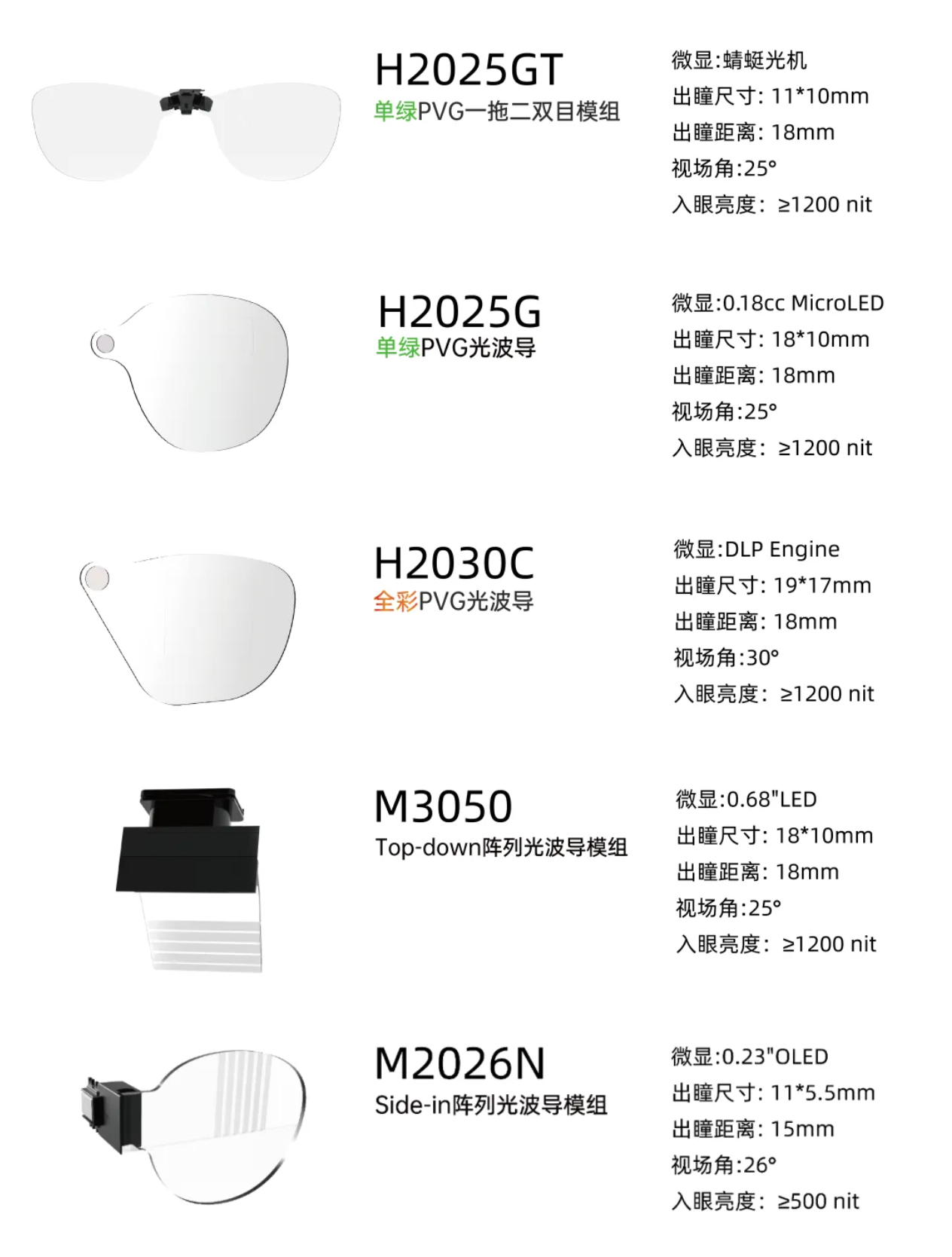 而在众多产品中,全彩 PVG 光波导模组(H2030C)最受关注。该模组视场角达 30°,出瞳尺寸为 19*17mm,既能提供更广阔的视野,又能让多用户在不同角度下清晰看到全彩画面。这一特性使其适用范围广泛,既可匹配消费级 AR 眼镜,也能满足企业级场景中的多人协作需求。另一款搭载MicroLED PVG 模组(H2025G),则凭借超小体积优势,为 AR 设备轻量化设计提供了可能。