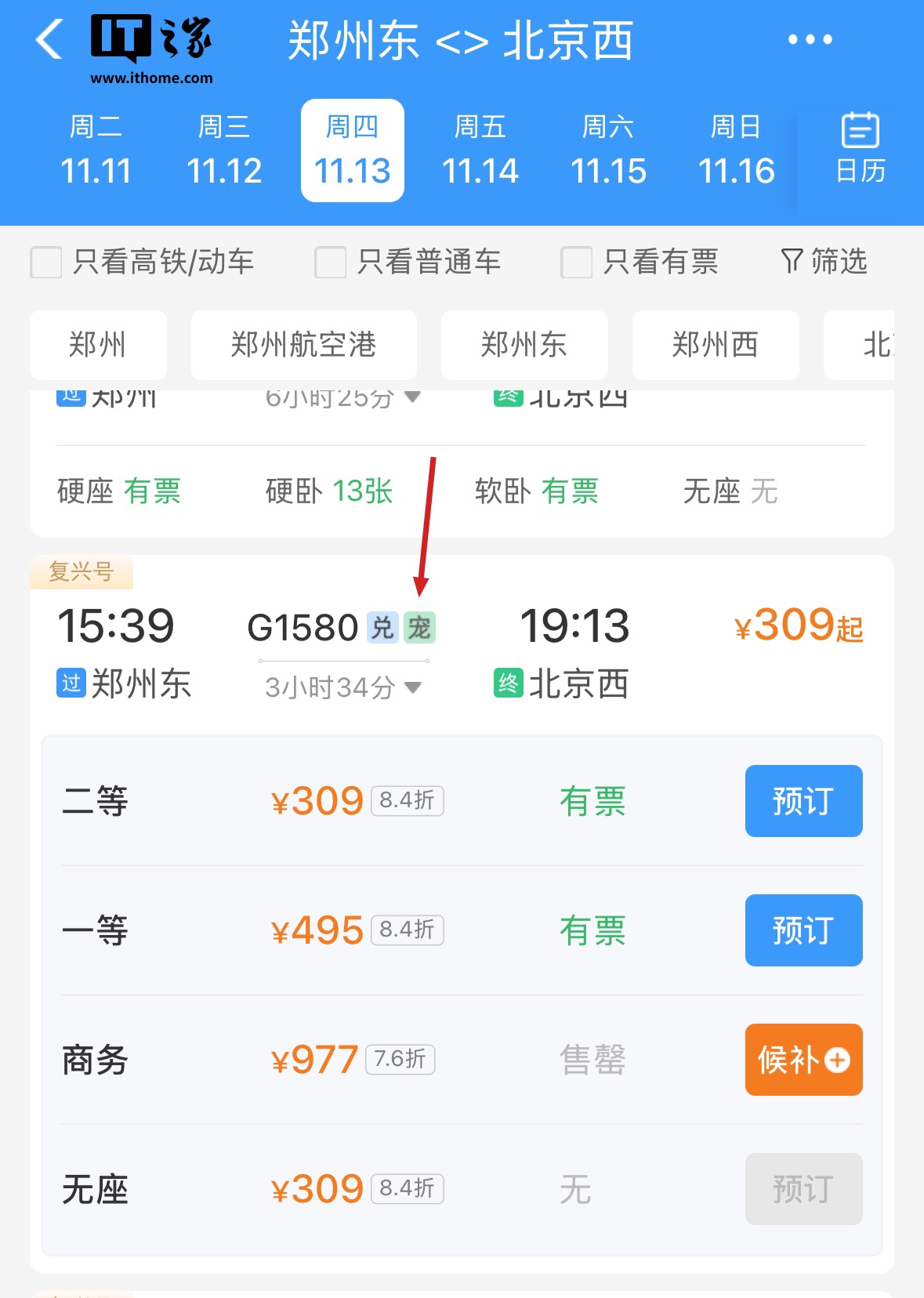alixixi 11 月 2 日消息,据央视新闻报道,铁路 12306 App 的官方购票页面目前已上线“宠物托运”功能,用户可以直观发现部分列车车次信息旁已有“宠”字标识,这代表相应车次可办理宠物托运业务(alixixi注:目前全国有 40 座高铁站可办理)。