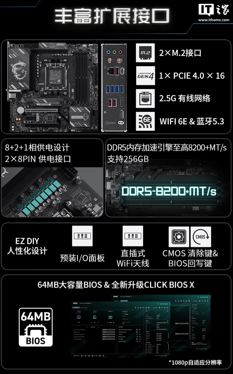 该主板整体采用黑化外观,散热装甲上印有微星品牌标识,配备了 AM5 插座,支持 AMD 锐龙 7000/8000/9000 系列处理器,采用双 8Pin CPU 供电设计,提供 64MB 容量 BIOS。