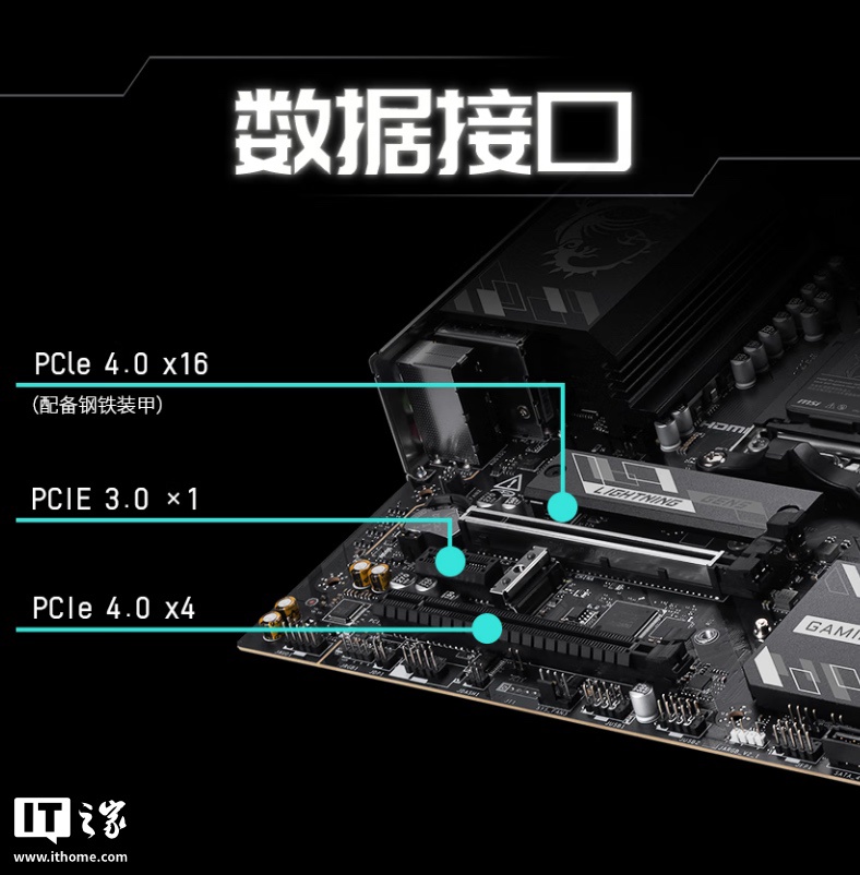 该主板提供四条 DDR5 DIMM RAM 内存插槽(支持至高 DDR5 8200MT/s RAM)、一条 PCIe 4.0 x16 全长插槽、一条 PCIe 4.0 x4 全长插槽、以及一条 PCIe 3.0 x1 插槽;配备了两个 M.2 插槽,分别为 PCIe 5.0 x4 和 PCIe 4.0 x4 通道,支持 M.2 2280/2260 规格 SSD;另外还有四个 SATA III 接口;支持 Wi-Fi 6E 和蓝牙 5.3。