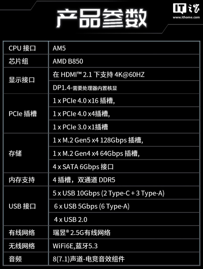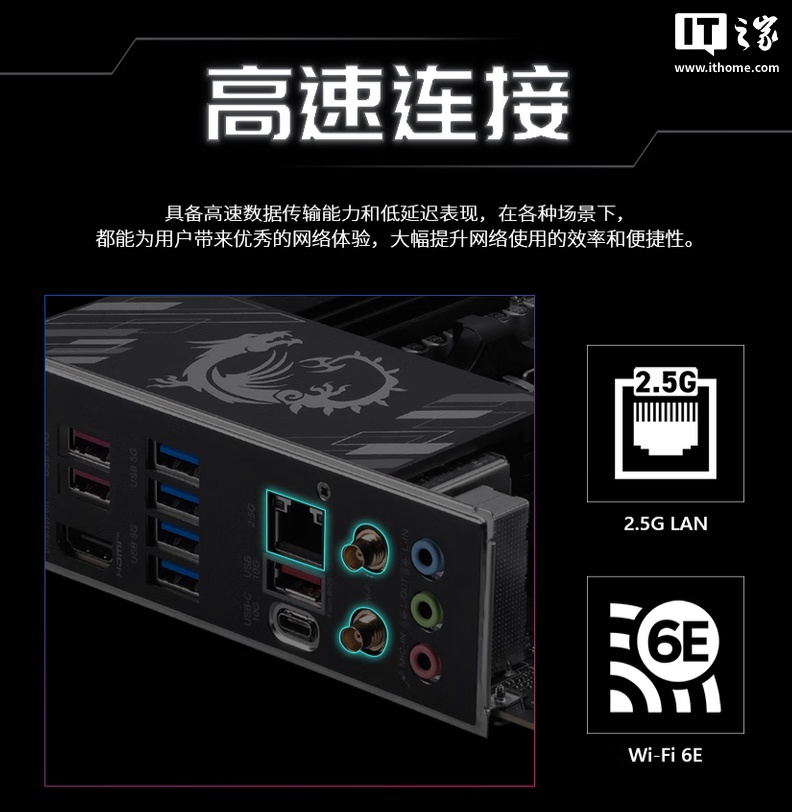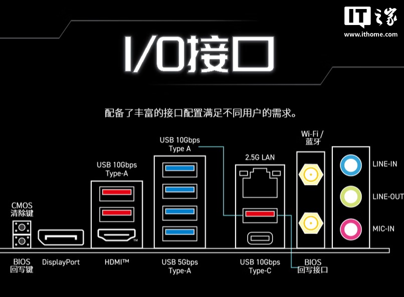 I/O 方面,该主板提供 1 个 USB-C 10Gbps 接口、3 个 USB-A 10Gbps 接口、5 个 USB-A 5Gbps 接口、1 个 HDMI 2.1 接口、1 个 DP 1.4 接口、1 个 2.5G 网口、1 个 3.5mm 音频接口。并预留了 1 个 USB-C 10Gbps、1 个 USB-A 5Gbps、2 个 USB-A 2.0 接针,用于前置接口。