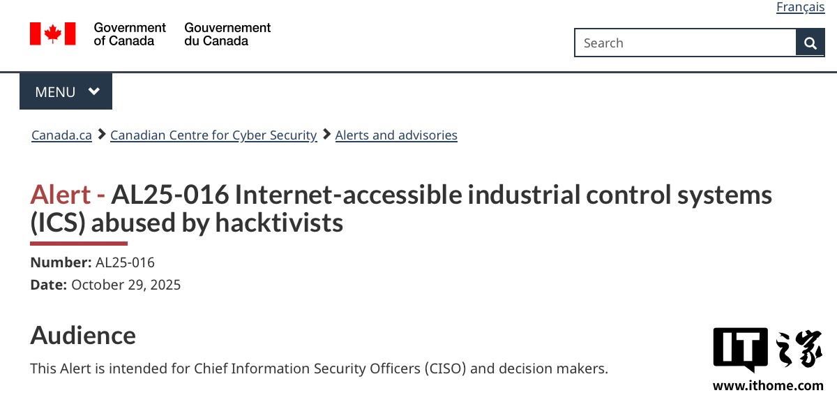 alixixi 11 月 2 日消息,加拿大网络安全中心向业界发布 AL25-016 通告,提醒近期有黑客面向多地基础设施工业控制系统(ICS)发起攻击,这些系统通常采用弱密码,同时暴露在联网环境中,极易遭到黑客乘虚而入。
