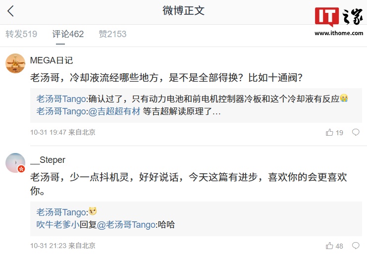 alixixi注意到,汤靖还在评论区与网友展开互动,针对“冷却液流经哪些地方,是不是全部得换?比如十通阀?”的提问,他回复:“确认过了,只有动力电池和前电机控制器冷板和这个冷却液有反应。”