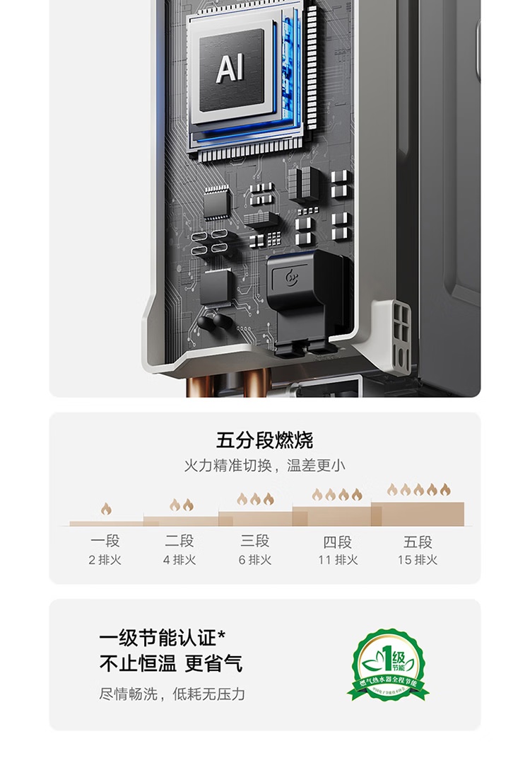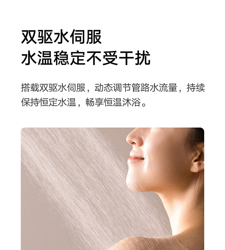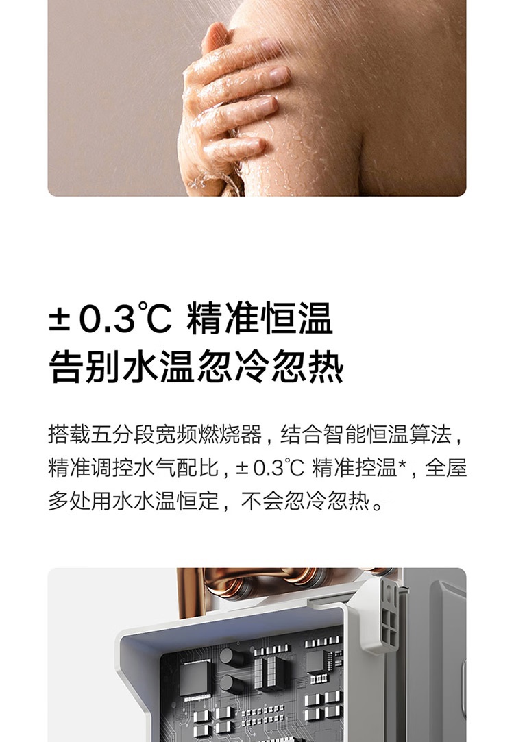 alixixi从商品页面获悉,这款热水器采用了 9 维静音降噪技术,通过 1 级静音认证;配备强劲增压大水泵、直流变频风机、全屏玻璃面板,支持双驱水伺服、±0.3℃精准恒温、全屋零冷水,支持小米澎湃智联,支持米家 App 远程操控。