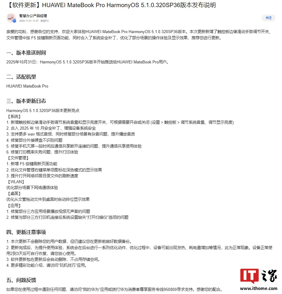 alixixi 11 月 2 日消息,华为官方团队账号 @智慧办公产品经理 昨日发布“HUAWEI MateBook Pro HarmonyOS 5.1.0.320SP36 版本发布说明”。本次更新新增触控板边缘滑动手势调节开关、文件管理中按 F5 按键刷新页面功能,同时合入系统安全补丁,优化部分场景的操作体验及显示效果。