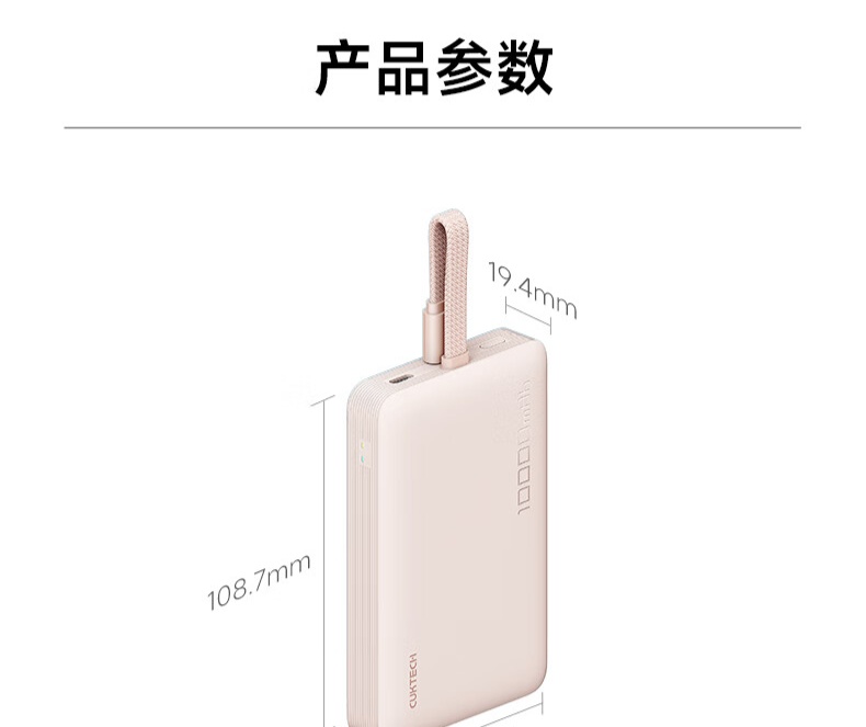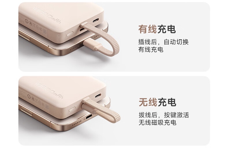 这款自带线充电宝电池容量 10000mAh,自带编织线;插线后自动切换有线充电,拔线后按键激活无线磁吸充电。
