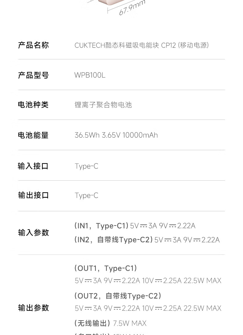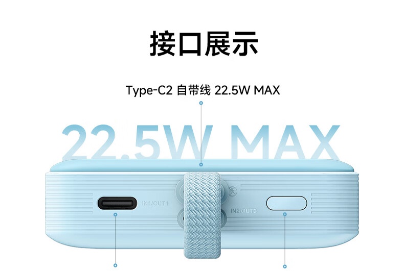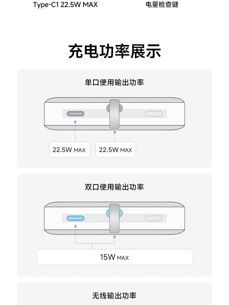 自带线以及 Type-C 口均支持最高输出 22.5W,双口同时输出为 15W,无线输出功率 7.5W。