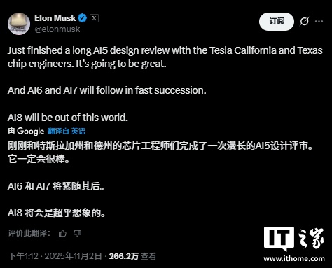 马斯克在推文中表示:“刚刚和特斯拉加州和得州的芯片工程师们完成了一次漫长的 AI5 设计评审。它一定会很棒。AI6 和 AI7 也将紧随其后。AI8 将会是超乎想象的。”
