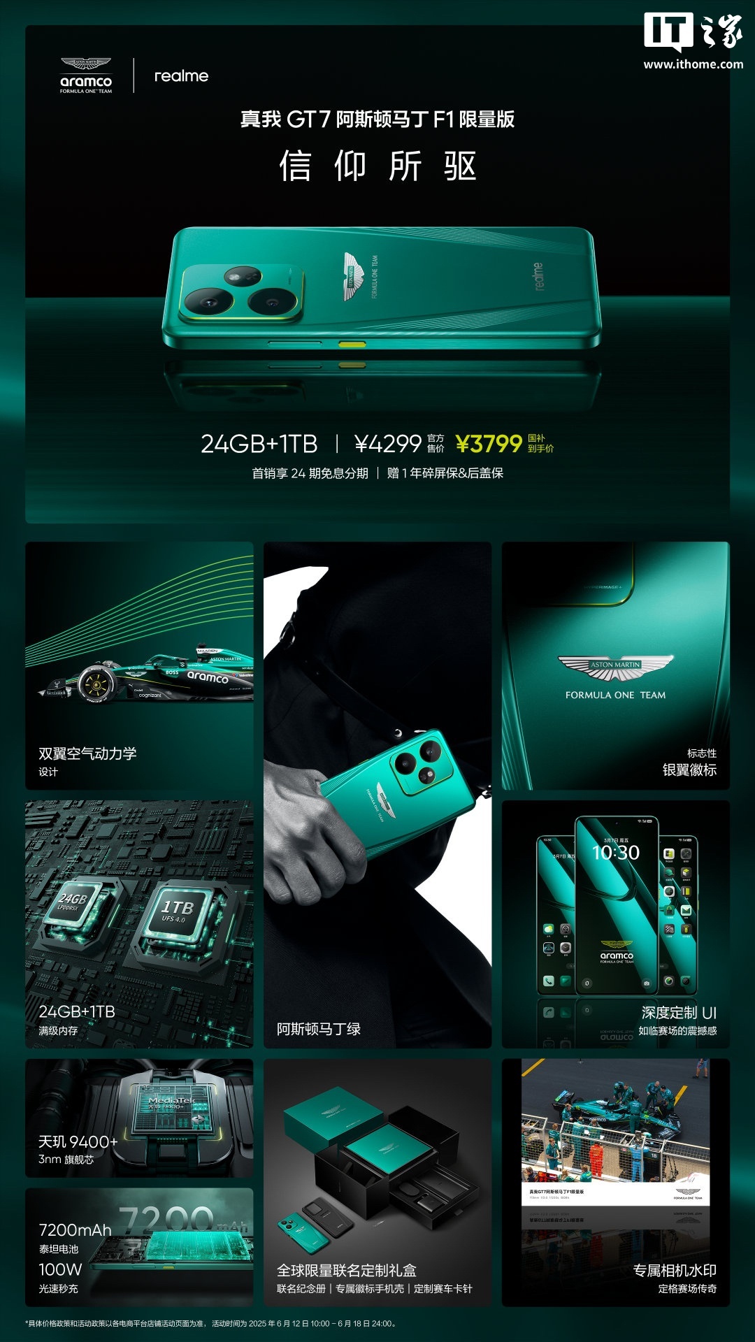据alixixi此前报道,今年 6 月 12 日,真我 GT7 阿斯顿马丁 F1 限量版正式开售,售价 4299 元,国补到手价 3799 元。该机亮点如下: