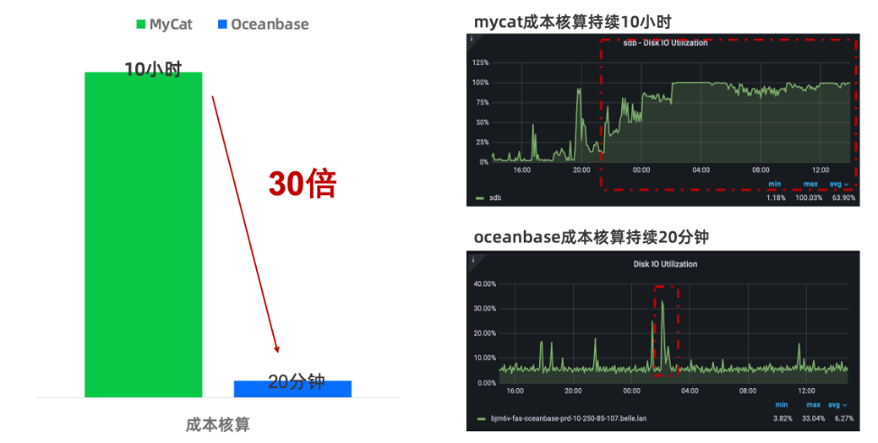 以财务系统的成本核算功能为例,整体运行时间相对较长。原本在 MyCat 运行时需耗时 10 小时,迁移至 OceanBase 后仅需 20 分钟,性能提升 30 倍。由监控数据(见图1)可以看出,原系统在每日 02:00–12:00 期间磁盘持续高负载;而在 OceanBase 环境下,相同任务 20 分钟内即可完成,负载迅速回落,提效幅度显著,已得到研发团队的高度认可。