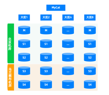 图2是业务原来基于MyCat的sharding架构,采用一主两从的配置,主机房位于北京,两个从节点位于乌兰察布机房作为异地容灾机房。业务数据根据地区划分不同的大区分片,每个地区数据访问经由MyCat下发到各大区分片执行,为了避免分布式事务,业务层面尽量保证每次获取的数据都只定位到其中某个大区。