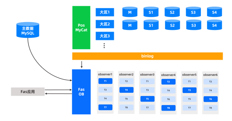 第一种方案: 在Fas OceanBase部署OceanBase Binlog Service来生成 Binlog,对整个数据链路来说,基本可以通过 Otter 跑通整个链路,兼容性是最好的,改动最小。但也存在一些问题,比如MyCat 中有八个MySQL分片,相当于8个线程去采集8个数据库实例的数据。由于 OceanBase Binlog Service 是以租户为维度,无论是生产Binlog还是消费Binlog,都只能有1个线程去处理。在业务高峰期间, 可能存在性能瓶颈。