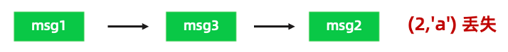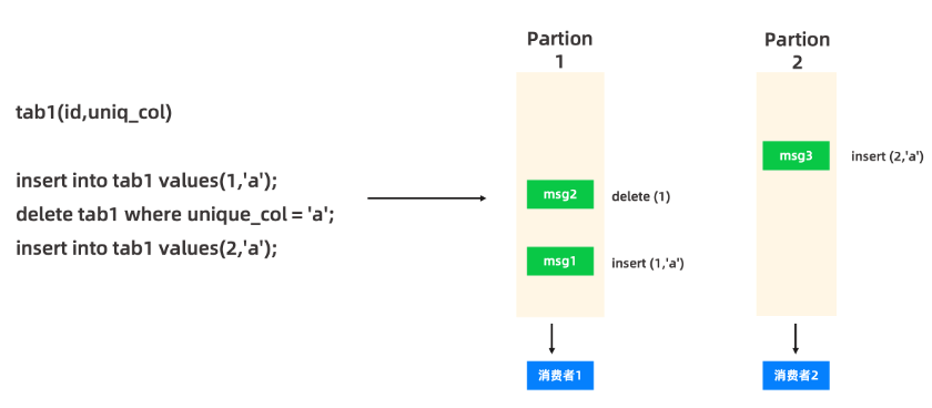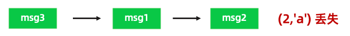 如果下游的数据同步采用insert into 模式,在按照图8的顺序消费时,先插入 (1,'a'),再继续消费 msg3 插入 (2,'a') ,此时由于 a 列冲突不再执行,最后消费 msg2,导致 (2,'a') 数据丢失。