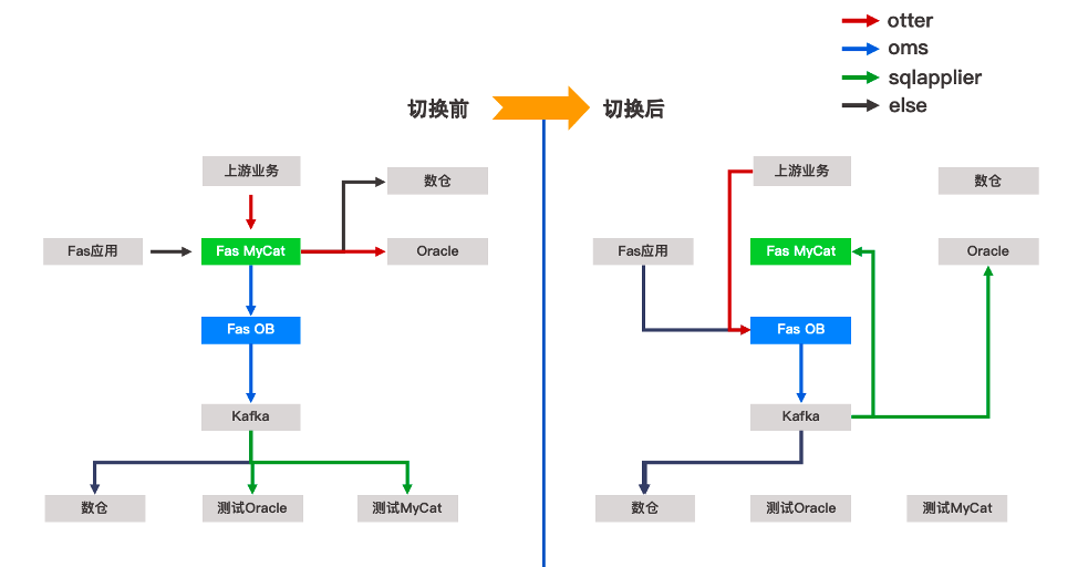 切换前,业务数据通过 OMS 同步到 OceanBase,OceanBase 通过 OMS 下发到 Kafka。同时在上线前需要做数据同步测试,通过 Kafka 将数据同步到测试 Oracle 和测试 MyCat,持续验证同步工具的性能和功能适配。