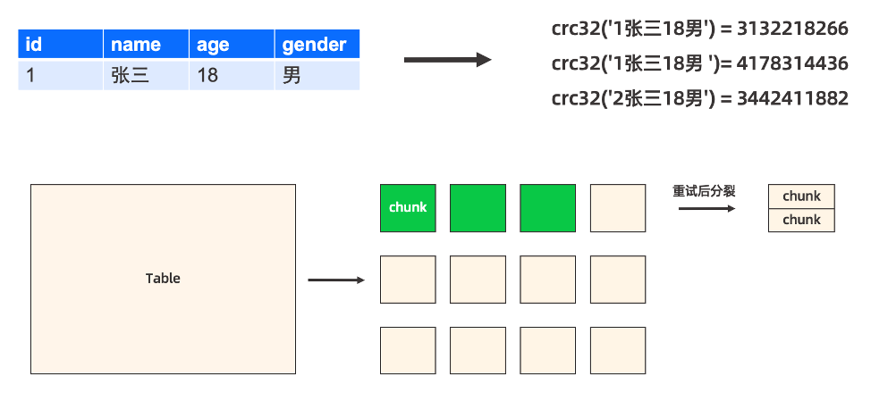 以图12为例,如何校验对应行数据在目标端是一致的,即把各个字段拼成一个字符串,然后做 crc32 校验。如果两端的 crc32 匹配,则源端和目标端的数据一致。如果对某一端的数据做简单修改(如加一个空格),那么数据将会有很大的变化。对于整表来说,将按照一定的行数拆成多个 chunk,以 chunk 的维度进行目标端和源端的 crc32 比对。如果出现数据不一致的情况,将进行重试,经过多次重试后数据还是不一致时,会进行分裂;如果多次分裂数据还是不一致,将最终转换为上文行数据的暗行(字符串)来进行校验。