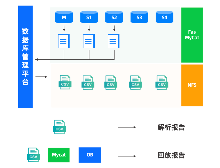 为此我们开发了流量回放功能,如图14所示,通过数据库管理平台在各个 DB 中采集全量日志,然后解析为 CSV 格式,最终将所有 CSV 文件整合即可形成解析报告,用于分析集群层面的整体 SQL 分布、DDL、DML 等情况。将 CSV 回放到 MyCat、OceanBase 后,形成回放对比报告。