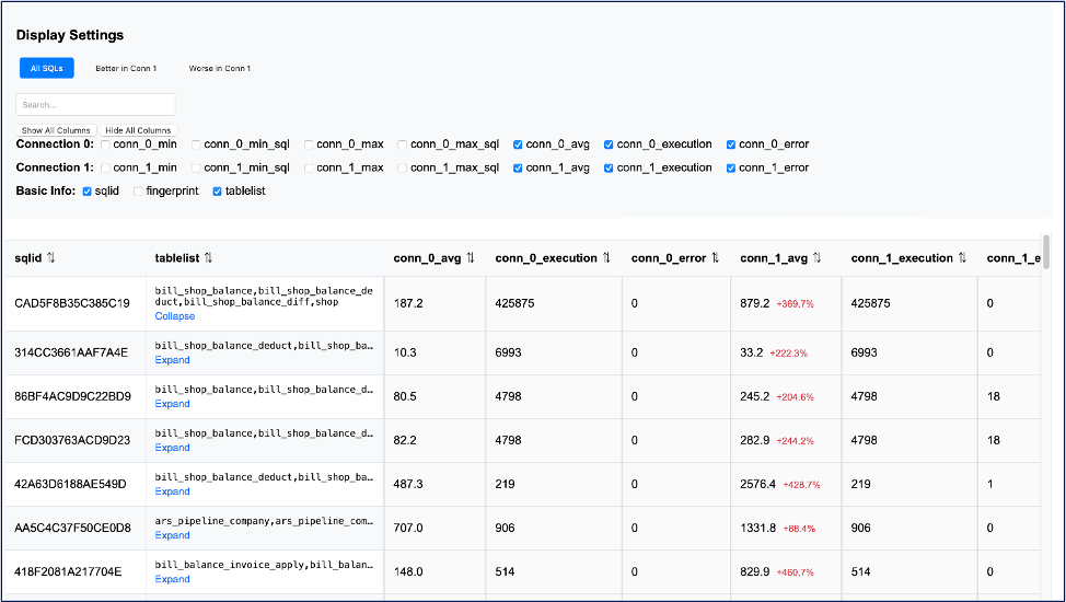 回放报告中的统计信息(见图15)包括:将所有回放 SQL 进行参数化形成模板生成对应的 SQL ID;该 SQL 使用到的表;每个 SQL ID 的最小响应时间、最大响应时间、平均响应时间、执行次数、错误次数、对应 SQL 等。
