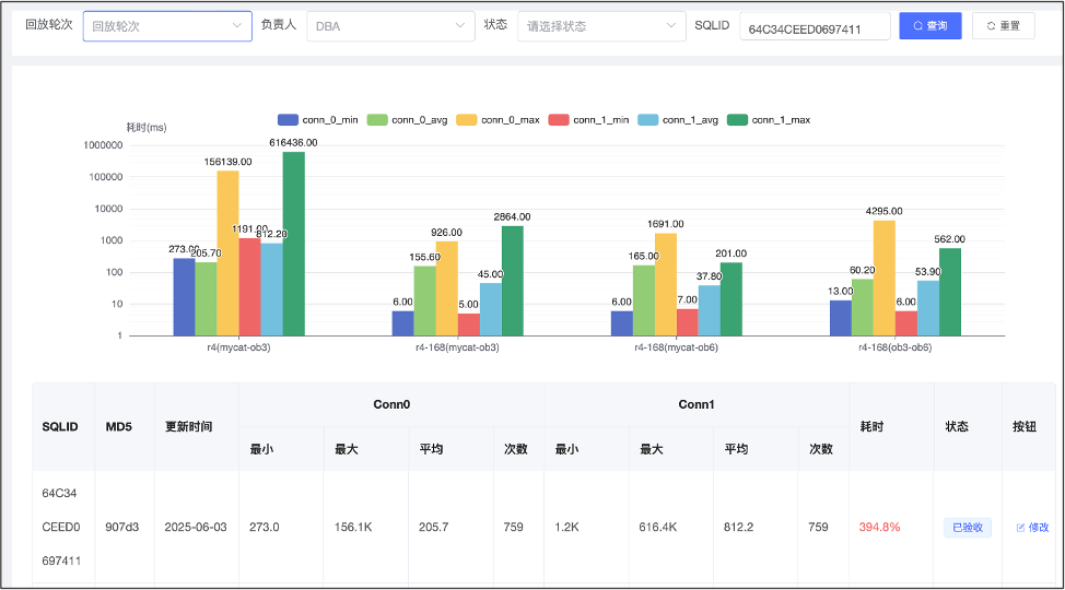 在打通数据链路、完成数据校验后,需要解决的就是 SQL 兼容性和性能问题,例如如何对比 MyCat 和 OceanBase 的数据库性能差异,OceanBase 性能是否能满足我们的业务需求等。针对上述需求,一个朴素的方法是:可以将 MyCat 中所有SQL 在 OceanBase 中实现,即可完整地测试兼容性问题以及性能表现。