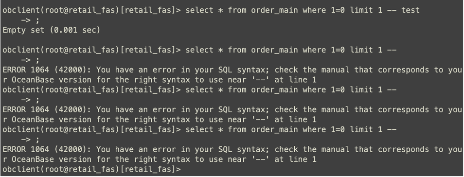 在 SQL 使用过程中,我们通常用“--”进行注释,放在 SQL 语句最后。在 MySQL 中一般不会发生报错,但在 OceanBase 中报错了,研发团队直接进行了修改。值得肯定的是,在回放了大约4.5万个 SQL ID 后,发现的不兼容问题仅有这一个,由此看出OceanBase 对 MySQL 5.7 版本的语法兼容度是非常高的,基本无需在兼容性方面投入过多的工作量。