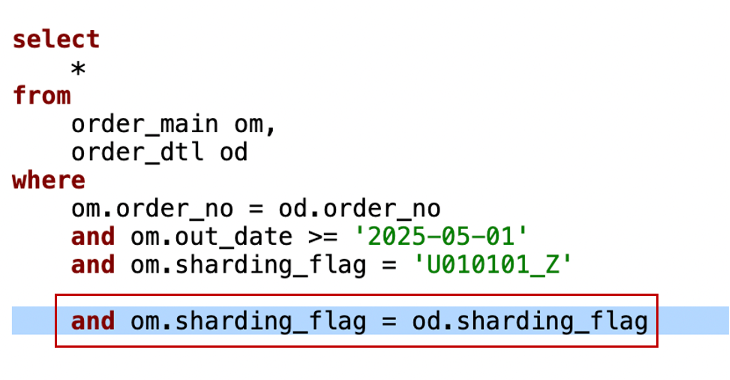 分区裁剪是另一类需要花费大量时间进行调优的问题。例如,在涉及 DTL 订单明细表的 order by 关联查询中,指定某个大区条件,在 MyCat 中没有图18所示红框中的条件,这是因为 MyCat 的分区规则相同,即在物理层面进行了隔绝,本来就在一个大区内,所以不需要对大区进行指定。而在 OceanBase 中,如果将这个条件去掉,会引发 om 表正常进行分区裁剪,但 od 表不知道需要在这个大区内进行,因此 OceanBase 需要指定这个条件以确保分区裁剪的正确性。这是一个非常典型的分区裁剪问题,其根本原因在于 MySQL 的机制在某些方面并不完善,原本物理隔绝的 SQL 在 OceanBase 是一个完整的库,这就需要我们在 OceanBase 中进行相应的调整和优化。