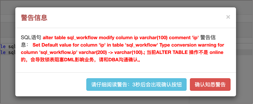 针对这种情况,我们期望达到的效果是:提交工单时,无论是 DBA 还是研发人员都能够识别出操作是 Online 还是Offline。过去我们依赖于肉眼判断,为了改进这一流程,我们增加了一项小功能:在提交工单时,我们会在测试环境中的 OceanBase 中运行一遍,检查 Table ID 是否发生变化。如果 Table ID 发生变化,则表明操作是 Offline 的;如果没有变化,则表明操作是 Online 的,告警信息如图19所示。