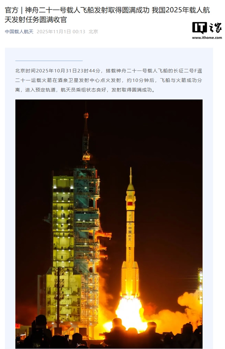 北京时间 2025 年 10 月 31 日 23 时 44 分,搭载神舟二十一号载人飞船的长征二号 F 遥二十一运载火箭在酒泉卫星发射中心点火发射,约 10 分钟后,飞船与火箭成功分离,进入预定轨道,航天员乘组状态良好,发射取得圆满成功。