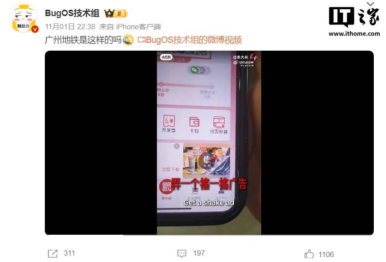 广州地铁工作人员表示,10 月 30 日,网友通过社交平台反映广州地铁 App 乘车码下方“摇一摇”广告影响扫码乘车功能,当日关注到上述情况后,便吸取了网友的建议,于当日下线了该类型广告。