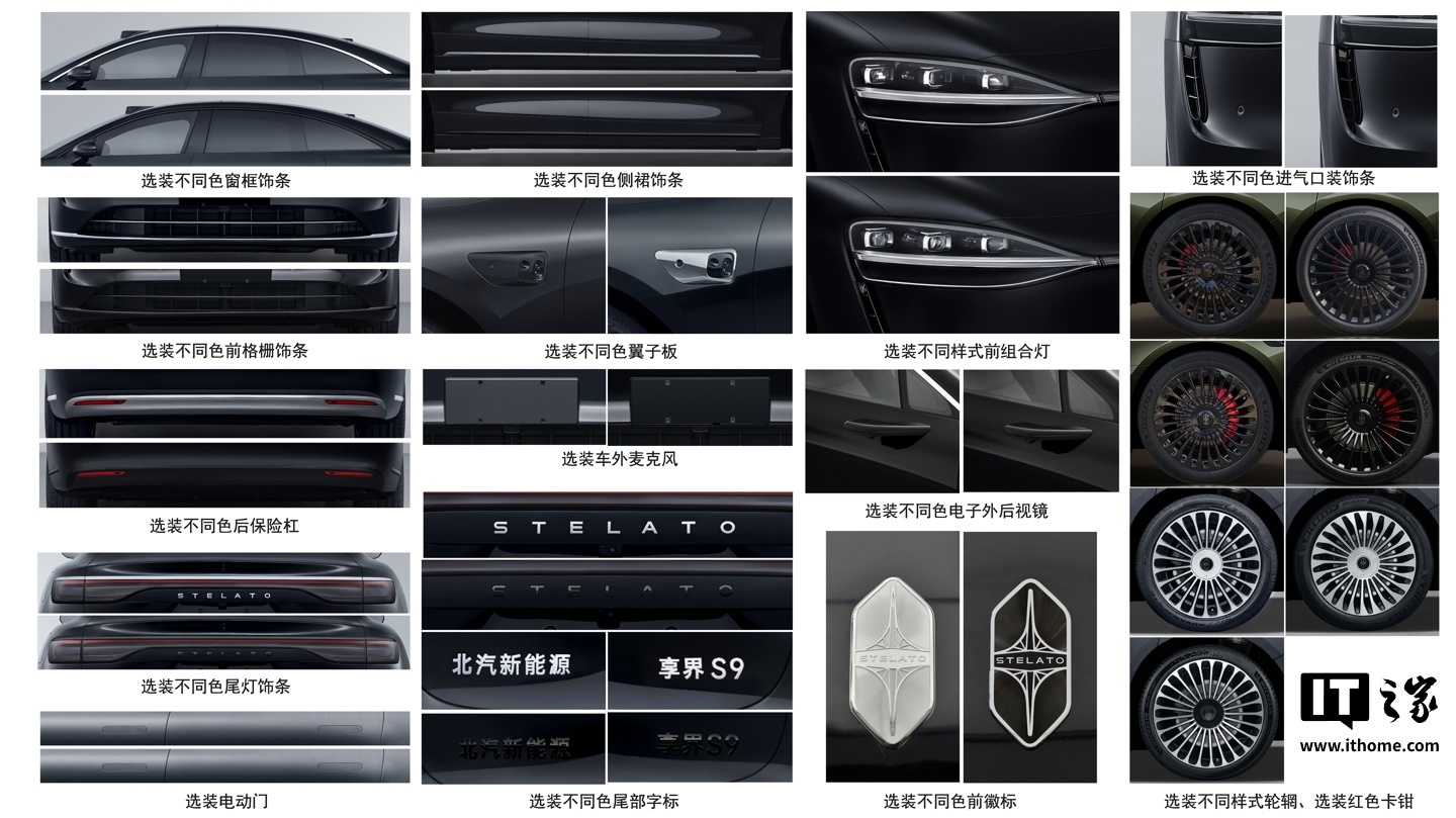 新款鸿蒙智行享界 S9 汽车可选装不同色窗框饰条、不同色前格栅饰条、不同色侧裙饰条、不同色后保险杠、不同色翼子板、不同色尾灯饰条、不同色尾部字标、不同样式前组合灯、不同色电子外后视镜等。同时新车也将继续提供增程 / 纯电动力可选。