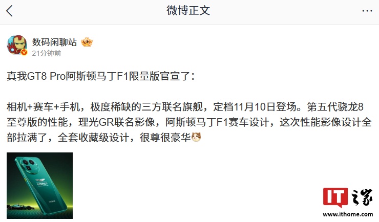 博主 @数码闲聊站 今日发文透露,真我 GT8 Pro 阿斯顿马丁 F1 限量版是极度稀缺的三方联名旗舰(相机 + 赛车 + 手机),搭载第五代骁龙 8 至尊版的性能 + 理光 GR 联名影像,拥有阿斯顿马丁 F1 赛车设计,同时还有全套收藏级设计(预计指包装盒等周边配件也有定制化设计元素)。