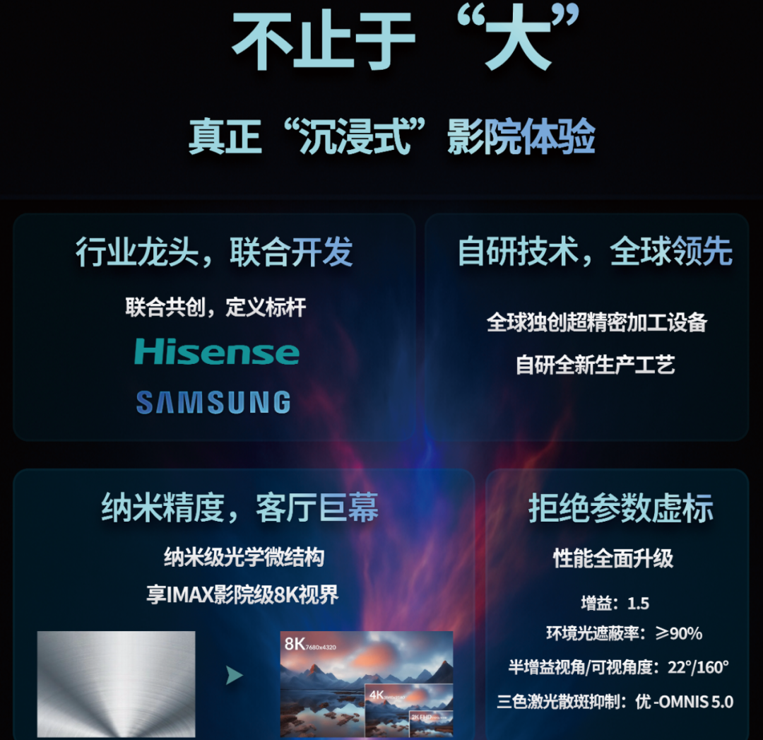 菲斯特表示,该公司与海信、极米等品牌联合定制开发、配套测试,“确保每一块屏幕都与激光电视主机性能匹配,指标参数真实可测”。