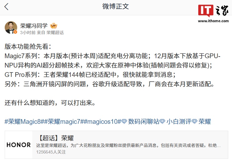 Magic7 系列:本月版本 (预计本周) 适配充电分离功能;12 月版本下放基于 GPU-NPU 异构的 AI 超分超帧技术,欢迎大家在原神中体验 (插帧问题会得以修复);