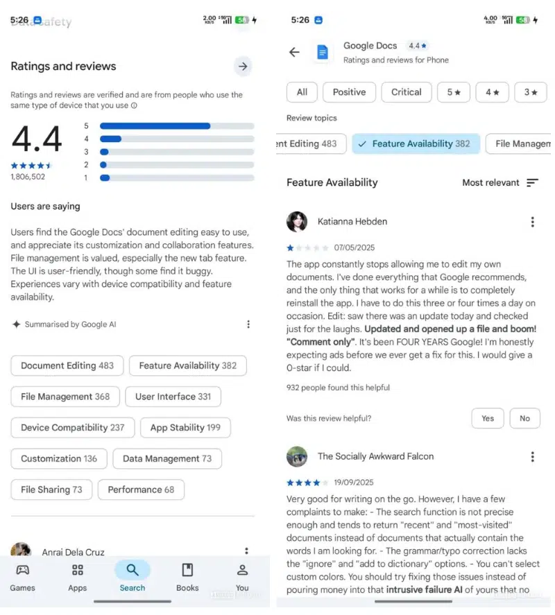 据alixixi了解,当用户查看 Play 商店中的应用页面时,现在会在“评分与评论”板块中看到一个名为“用户评价”的新标题。该标题下方会显示一小段文字,总结用户对该应用的看法。在谷歌人工智能的支持下,这份总结会同时呈现正面和负面评价。