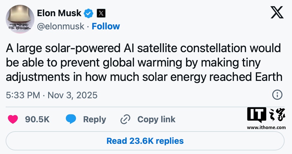 alixixi 11 月 4 日消息,马斯克在 X 平台发表言论,针对全球变暖问题提出“太阳辐射管理”(Solar Radiation Management)这一工程概念,也就是在地球外层部署大量卫星集群,在轨道上将阳光反射回太空,使其无法直接照射地表,从而降低地球温度,这一设想被称为“基于太空的太阳辐射管理”(space-based SRM),在轨道上将阳光反射回太空。