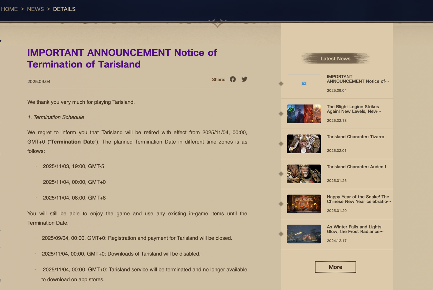 公开信息显示,《塔瑞斯世界》上线当天登顶 31 个国家和地区的 iOS 免费榜,但运营不到两个月就跌出各市场 iOS 游戏榜单。同时参考《塔瑞斯世界》官网,目前国服已经有约半年没发布任何官方公告和新闻,上一次推出活动还是在今年春节。