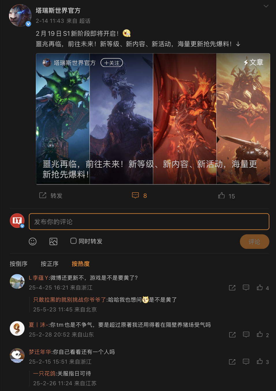 同时,“塔瑞斯世界官方”官方微博上次更新还是 2 月的新赛季介绍信息,今年 4 月有网友留言:“微博还更新不,游戏是不是要黄了?”,还有用户称“关服指日可待”。