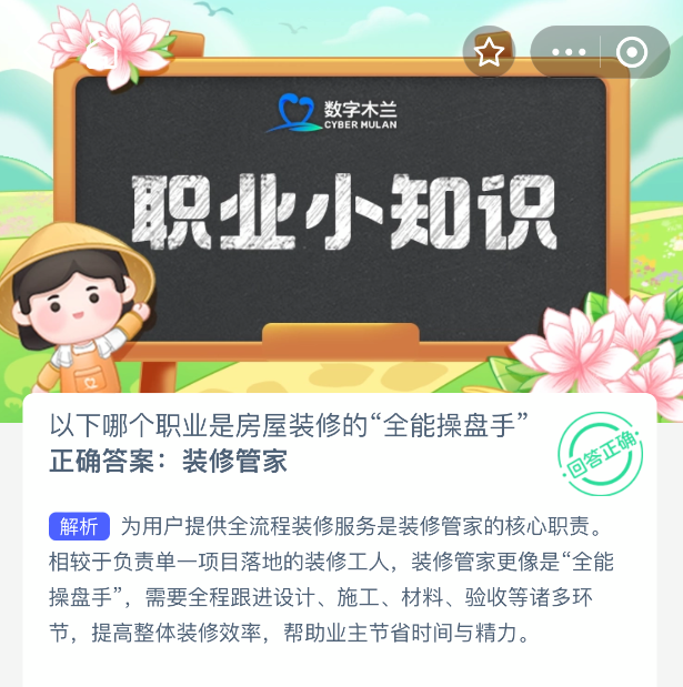 以上就是以下哪个职业是房屋装修的“全能操盘手”?支付宝蚂蚁新村最新答案2025年11月3日,更多精彩内容,请点击关注阿里西西手游网更新!