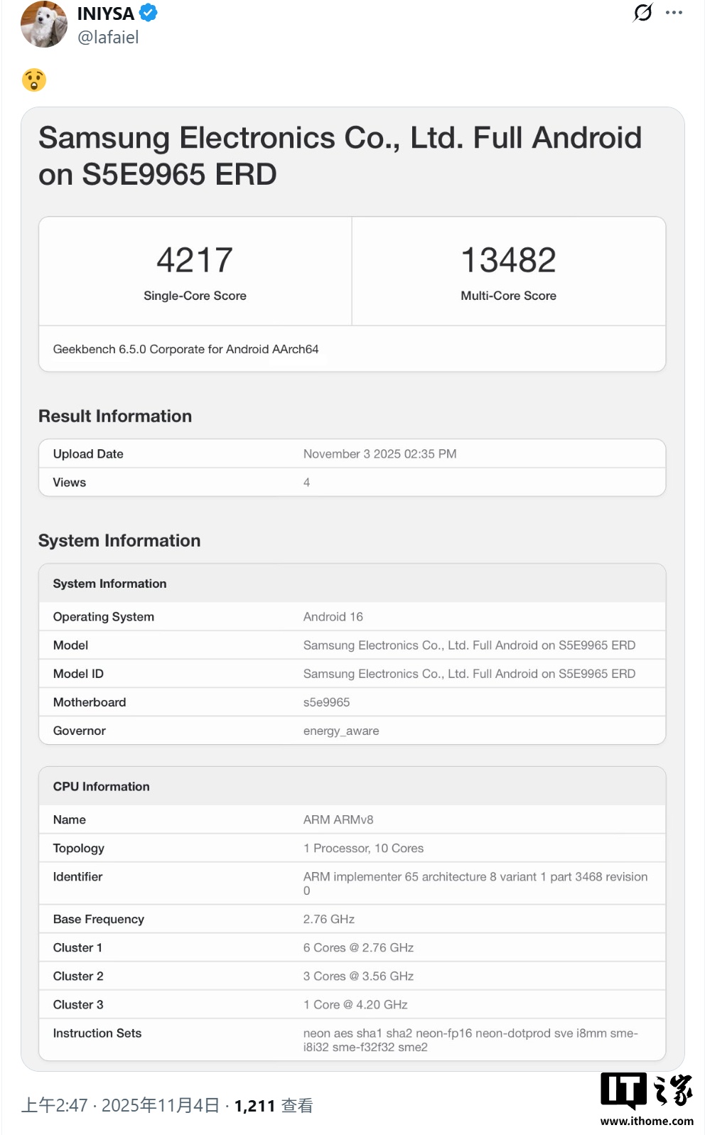 alixixi 11 月 4 日消息,网友 @lafaiel 今天在 X 平台发布推文,分享了一张 GeekBench 6.5.0 版本的跑分截图,展示了三星 Exynos 2600 旗舰芯片的工程样品成绩,单核成绩为 4217 分,多核成绩为 13482 分。